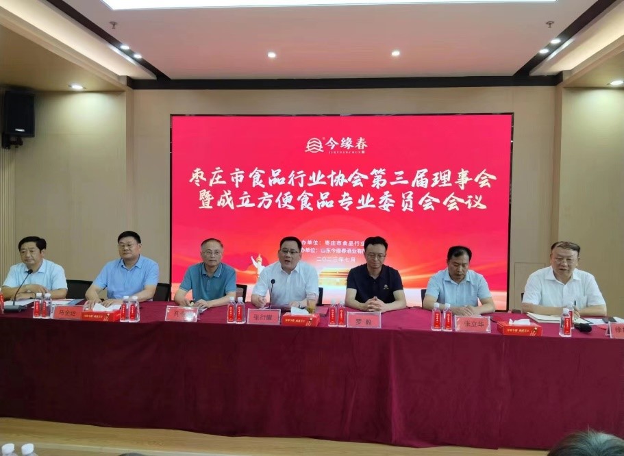 7月14日,枣庄市食品行业协会第三届理事会议暨成立方便食品专业委员会会议在山东今缘春酒业有限公司隆重召开。枣庄市市场监管局副局长张衍耀、山东今缘春酒业有限公司董事长罗毅、枣庄学院beat365唯一官方网站院长张立华、枣庄市食品行业协会会长徐加龙等出席会议并发表讲话。我市食品行业协会新、老会员单位代表共计100余人参加会议。