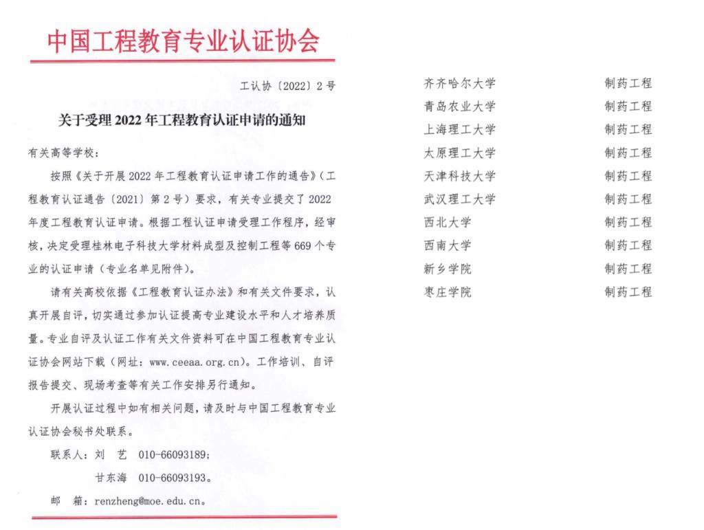 1月27日,中国工程教育专业认证协会公布了《关于受理2022年工程教育认证申请的通知》(工认协〔2022〕2号),我院制药工程专业认证申请喜获中国工程教育专业认证协会受理,实现了枣庄学院工程教育认证的突破。