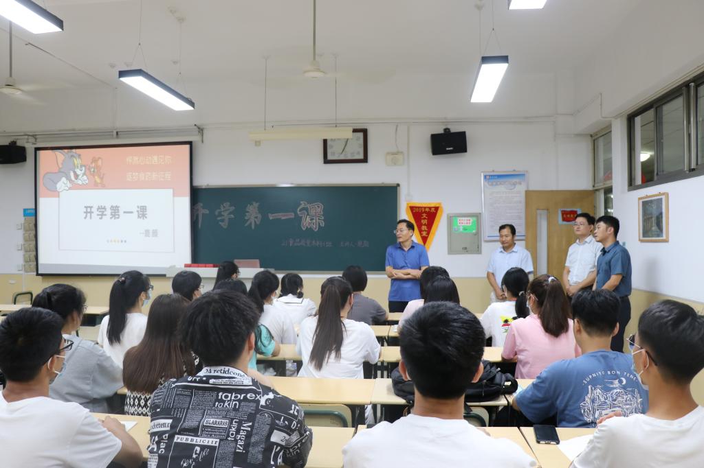 9月17日晚,学院分班级召开2021级新生“开学第一课”。学院党总支书记滕聿峰、院长张立华深入新生班级,欢迎2021级新生加入学院大家庭并成为新的主人,动员新生在将来的大学生活中,自觉增强爱国意识,努力学习专业知识,积极参加实践锻炼,系统做好学业规划,严格做好疫情防控,树牢安全底线意识,系好人生第一粒扣子,争做新时代合格大学生。新生辅导员、班主任召开主题班会,明确在校期间应遵守的规章制度,细化日常管理要求,组织学生学习疫情防控知识和校园安全知识,加强新生军训和国防观念教育。