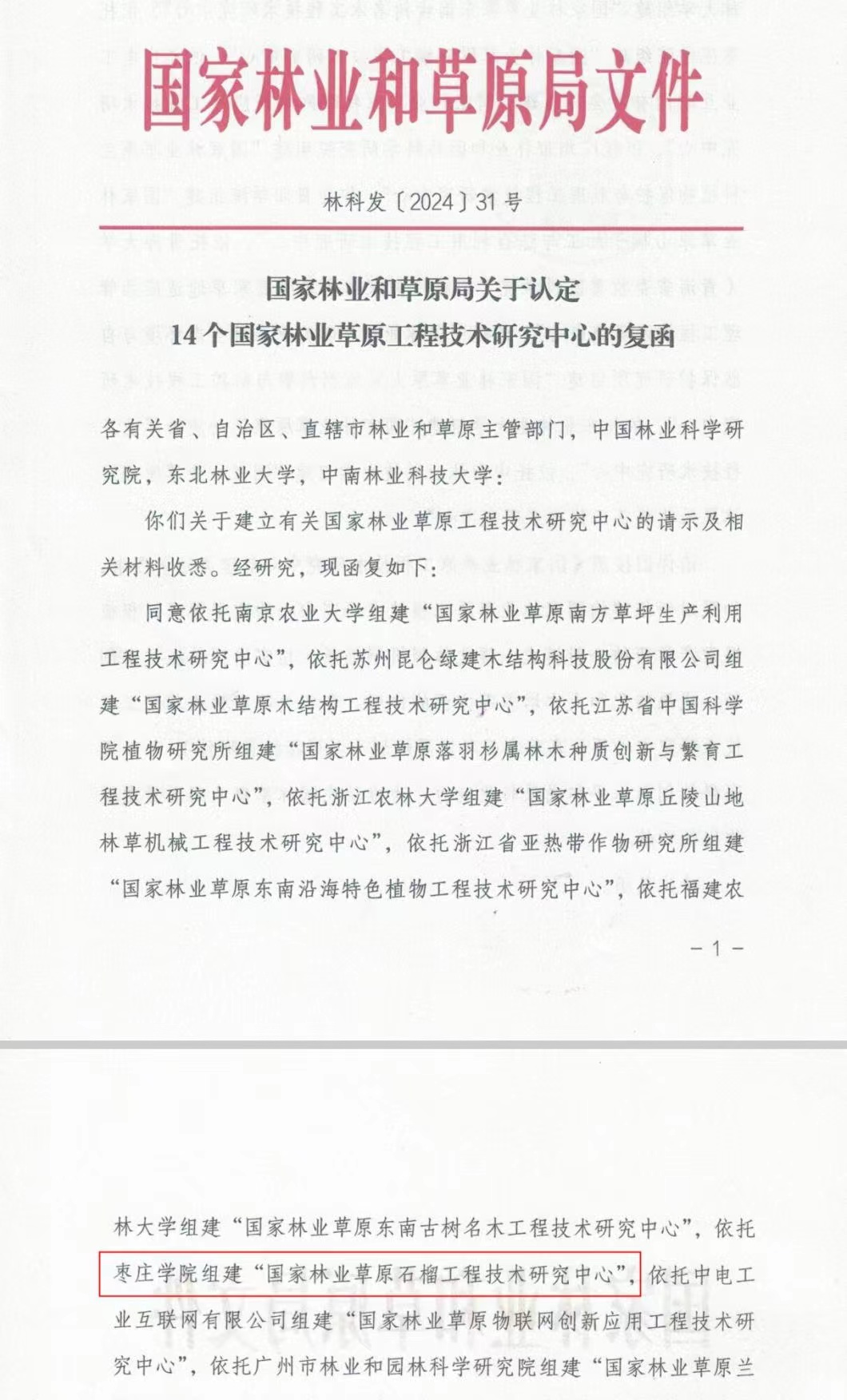 近日,国家林业和草原局发布《关于认定14个国家林业草原工程技术研究中心的复函》(林科发〔2024〕31号),依托我校组建的“国家林业草原石榴工程技术研究中心”获批。