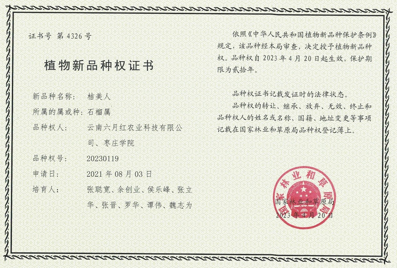 我校beat365唯一官方网站“石榴+植物资源科研团队”,利用山东省石榴精深加工工程技术研究中心和山东省石榴资源综合开发工程实验室的科研平台优势,与省内外科研院所、企业等开展广泛的技术合作。近日,该团队联合云南六月红农业科技有限公司申报的一个石榴植物新品种‘桔美人’,获得国家林业草原局的授权。该品种是由‘红如意’与‘Wonderful’杂交培育而成。具有早熟、丰产、稳产、果个大、果皮浓红、籽粒紫红、抗病、抗裂果、可溶性固形物含量高、挂树时间长(30天)等优良特性,籽粒风味甜、微酸,更适合中国大众消费口味。果实近球形,果皮桔红色。大型果,平均单果质量452g;籽粒紫红色,百粒质量44.6g;籽粒硬度2.12kg/cm2;平均可溶性固形物含量15.9%,总糖含量15.20%,总酸含量3.04g/kg,糖酸比50.0,风味酸甜;综合品质优良。‘桔美人’丰富了我国石榴品种,在一定程度上可促进石榴产业的发展。