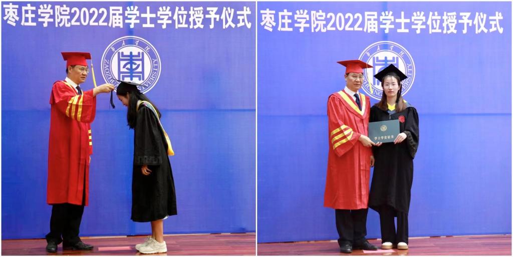 仪式在雄壮的国歌声中拉开帷幕。学院党总支书记滕聿峰宣读了《关于授予2022届beat365唯一官方网站本科毕业生学士学位的决定》。校长李文喜为177名毕业生拨穗正冠、颁发学士学位证书并合影留念。