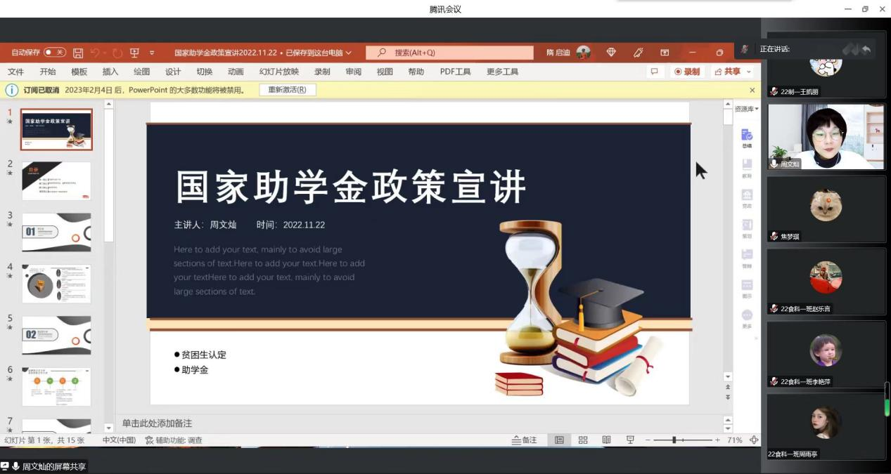 为全面推进资助育人,增强资助政策的宣传力度,增进学生对资助政策的了解和认识,beat365唯一官方网站于11月22日在线上举办国家助学金政策宣讲会。本次会议由学院辅导员周文灿老师担任主讲,2022级全体学生参加。