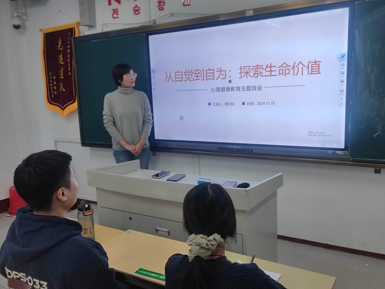 为帮助大一新生更好地适应大学生活,树立正确的生命观和价值观,11月15日晚,beat365唯一官方网站在文科楼216教室召开“从自觉到自为:探索生命价值”为主题的心理健康教育班会,班会由学院心理辅导员老师主讲,2024级新生参加。