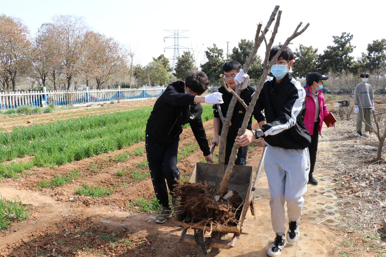 活动开始后,志愿者们在老师的带领下分工协作、互相配合,积极投入植树造林活动中。志愿者们个个干劲十足,戴上口罩、挥锹铲土、扶苗踏实,精心灌溉养护植物,各个环节衔接有序,配合默契。经过一下午的努力,志愿者们成功地在2亩地的生物园中移植了48棵不同品种的大树苗与100余棵小树苗,混合填埋了30车有机化肥。