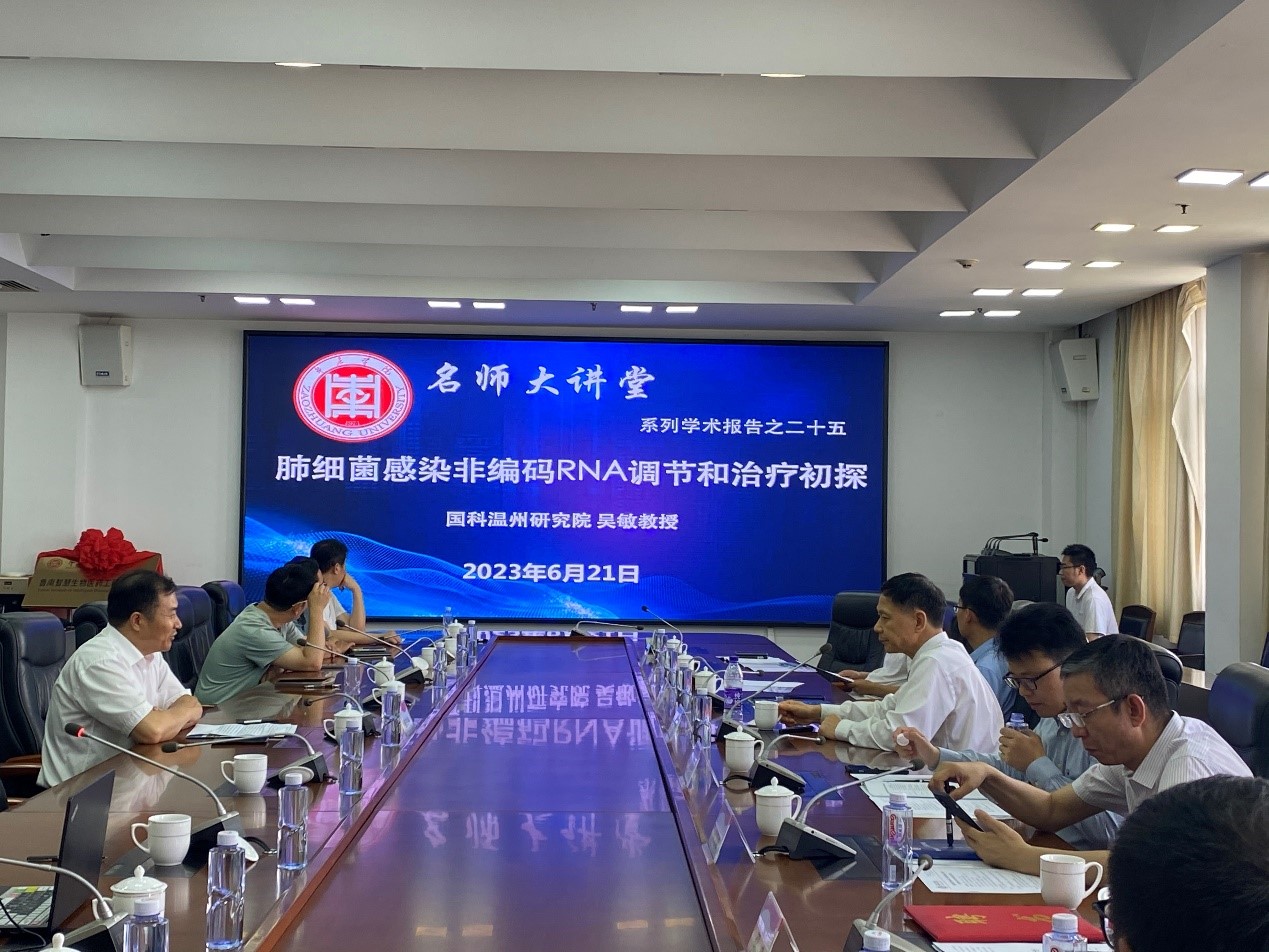 6月21日上午,由beat365唯一官方网站邀请的中国科学院大学温州研究院特聘研究员,“长江学者”吴敏教授在综合楼三楼会议室做客我校“名师大讲堂”,为我校师生作了题为“肺细菌感染非编码RNA调节和治疗初探”的学术报告。beat365唯一官方网站全体专业技术人员及生物制药专业部分学生参加了会议,报告会由beat365唯一官方网站院长张立华主持。