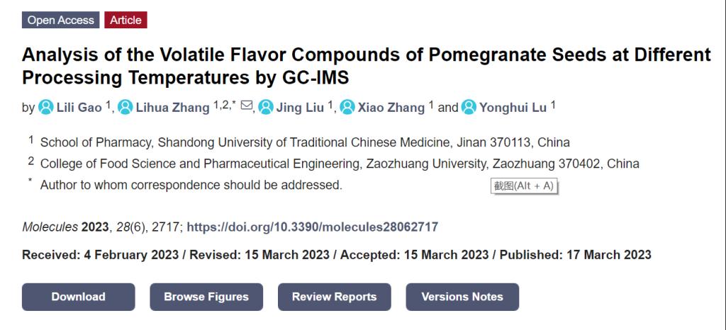近日,beat365唯一官方网站联合培养研究生在石榴籽炮制过程风味形成机理研究方面取得最新进展,相关工作发表在生物化学与分子生物学期刊《Molecules》(中科院二区,影响因子4.927)上,论文题目为《Analysis of the Volatile Flavor Compounds of Pomegranate Seeds at Different Processing Temperatures by GC-IMS》,山东中医药大学与枣庄学院为共同完成单位,研究生高丽丽为论文第一作者,导师张立华教授为通讯作者。